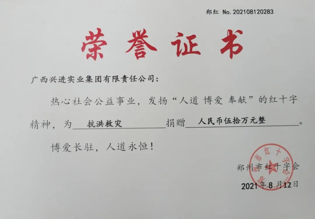 今年夏天,河南發(fā)生罕見洪災,多地抗洪救災形勢十分嚴峻。為了幫助河南人民渡過難關,興進集團通過鄭州市紅十字會向災區(qū)捐贈50萬元善款,以實際行動為受災群眾、抗洪一線的救援人員提供支持。
