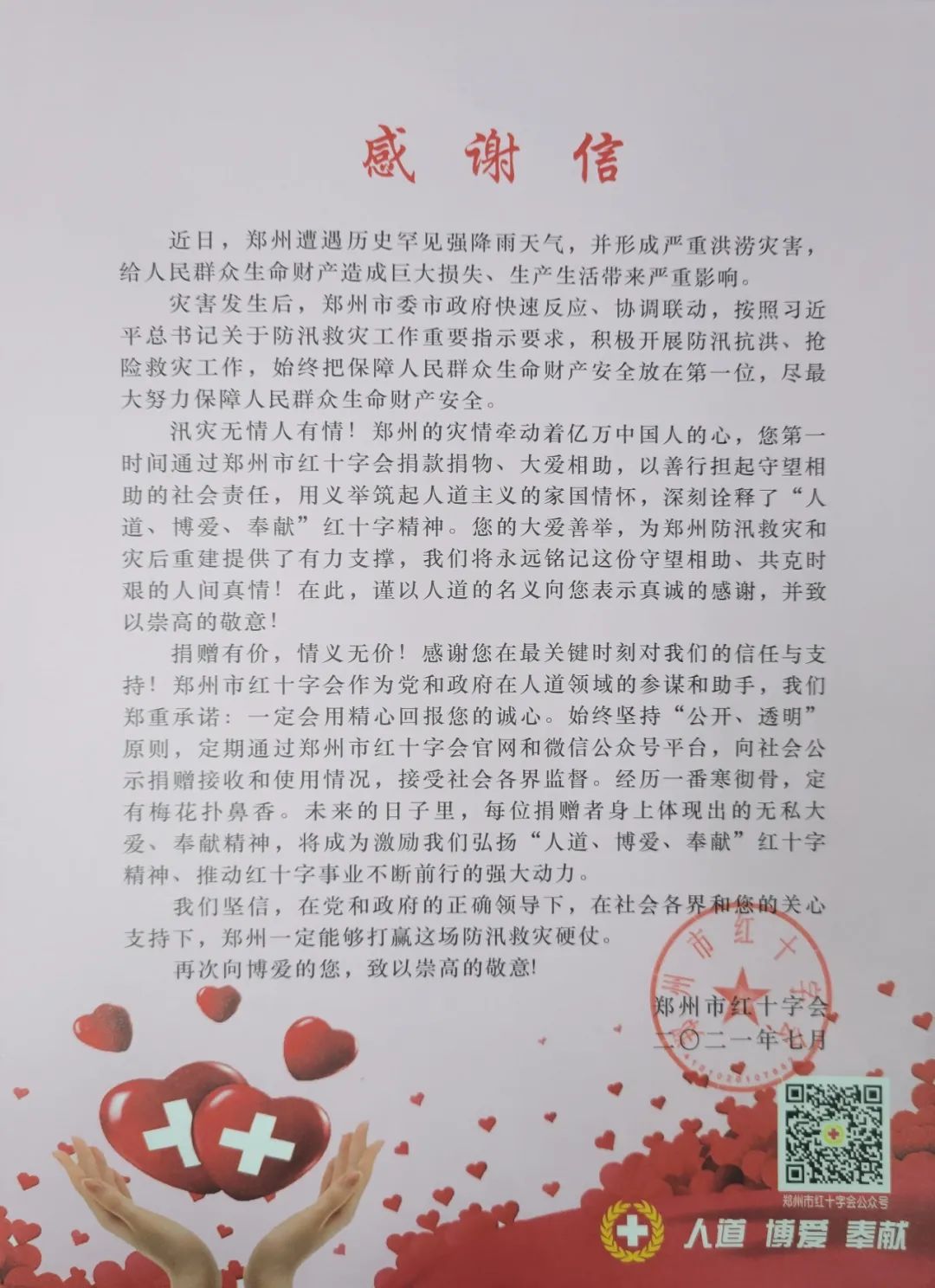 鄭州市紅十字會向興進集團的捐贈表達感謝