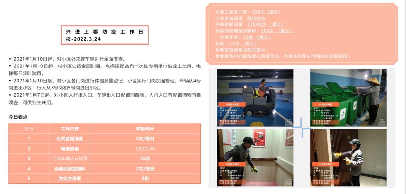疫情伊始,興進(jìn)服務(wù)集團(tuán)第一時(shí)間成立"防疫領(lǐng)導(dǎo)小組",持續(xù)創(chuàng)新防疫及服務(wù)措施,出臺(tái)《興進(jìn)服務(wù)集團(tuán)防疫指南》,屆時(shí)全員"領(lǐng)命出征",取消休假、時(shí)刻備戰(zhàn),集團(tuán)在做好員工心理疏導(dǎo)工作的同時(shí),為保護(hù)業(yè)主和美好家園全力以赴。