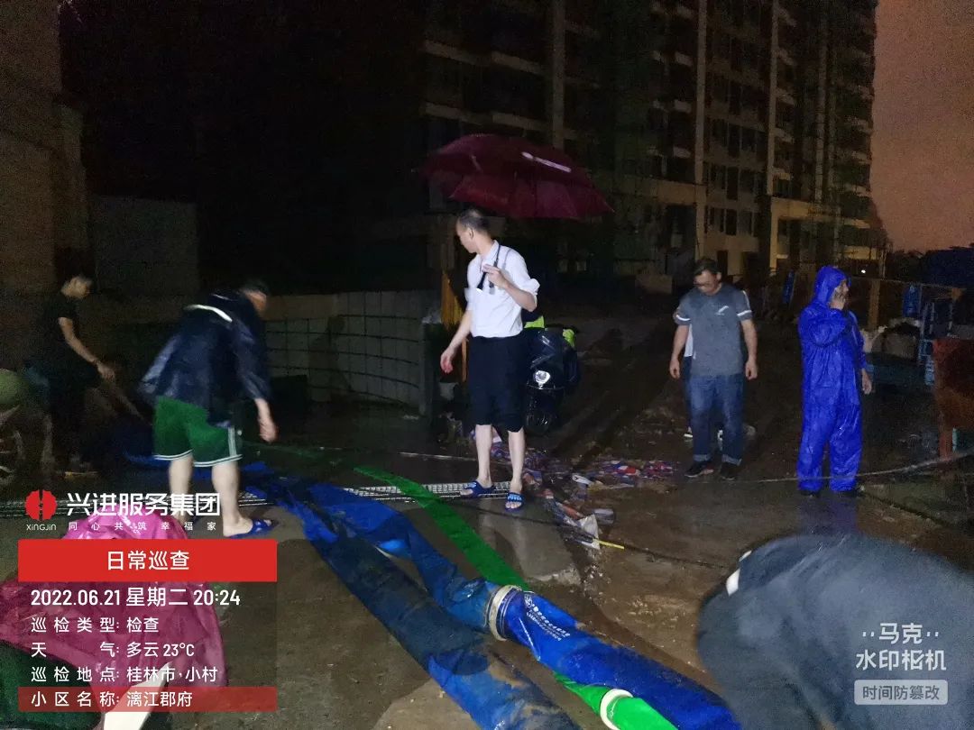 6月22日,漓江桂林城區(qū)河段出現(xiàn)超警2米左右洪水,超2019年最高水位。面對此次特大汛情,集團(tuán)領(lǐng)導(dǎo)班子高度重視,親臨現(xiàn)場指導(dǎo),工程部、物業(yè)及商業(yè)積極聯(lián)動互通,各項目負(fù)責(zé)人冒著雷暴天氣緊急趕往現(xiàn)場指揮。