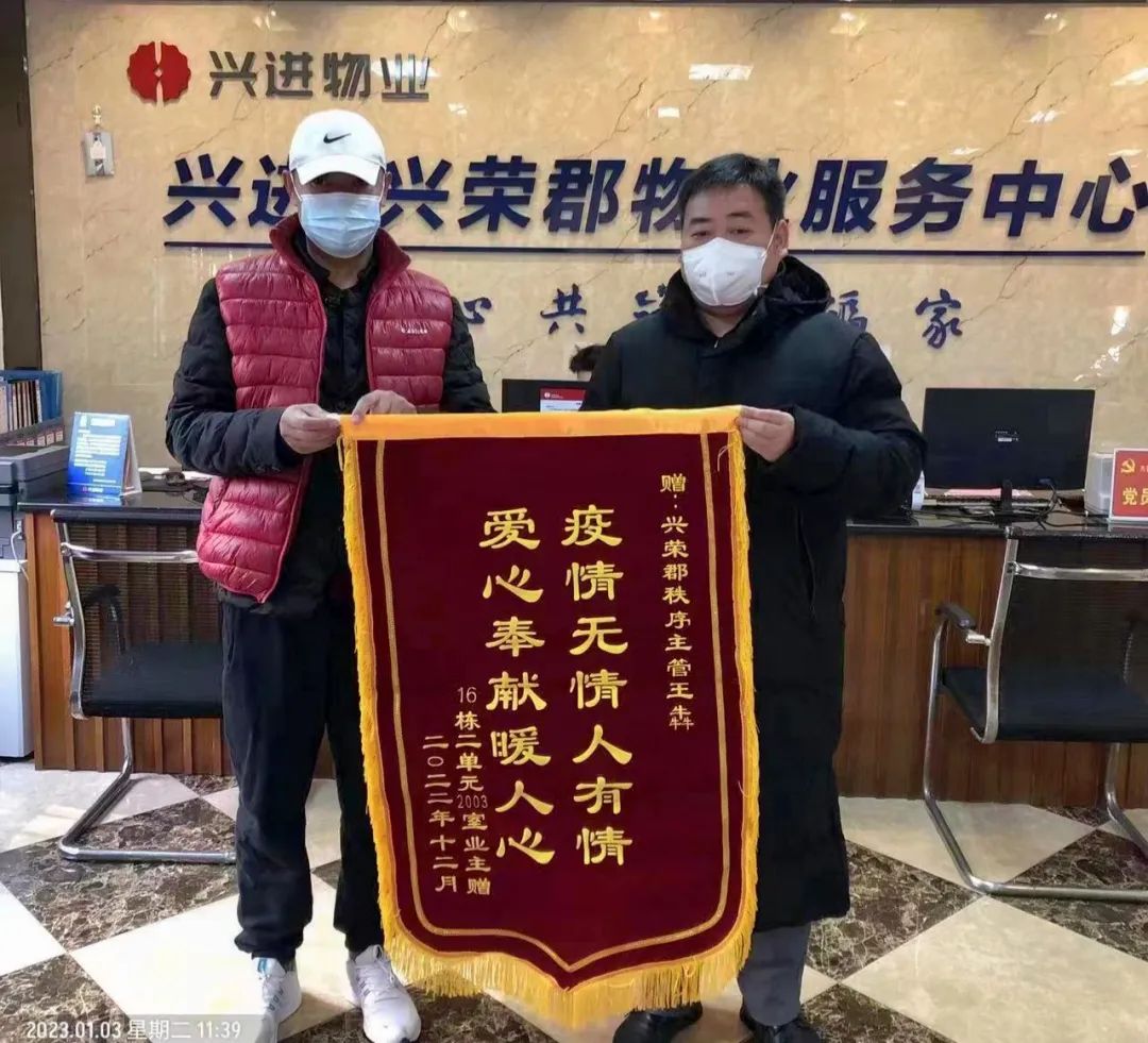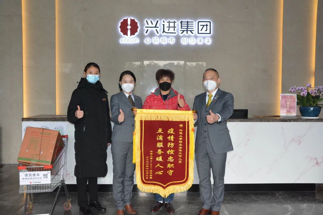 在2022年底,興進業(yè)主邵先生因為在外地工作,父母年紀大了,在家生病而無人照顧。接到業(yè)主求助后,興進物業(yè)王主管積極地幫助老人送物資送藥,像家人一樣照顧他的父母,邵先生工作結(jié)束回來后,看到興進物業(yè)人的盡心盡力的付出,十分感動,特意制作了一面錦旗表達感謝。