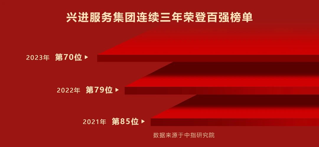 二十二載勵精圖治,興進服務集團憑借在發(fā)展規(guī)模、服務品質、科技賦能、業(yè)主滿意度以及增值服務等多方面的優(yōu)異指標,榮膺"2023中國物業(yè)服務百強企業(yè)",第70名。